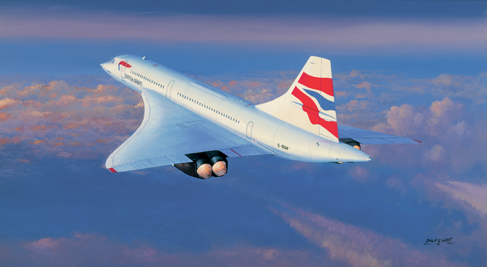 Farewell Concorde – As Concorde G-BOAF accelerates into the setting sun, her speed will soon outpace the earth’s rotation. The 100 passengers will now have the unforgettable experience of watching the sun rising from the West. At 50,000 feet, the cruising speed of Mach 2 (1,320 mph) is reached; but the climb gently continues towards 60,000 feet. Here, on the threshold of space, the passengers will dine. Three and a half hours after take-off from London, Concorde reaches New York. On 26th November 2003 this aircraft returned to its first home, Filton, Bristol – probably never to fly again. The 50th anniversary of Concorde’s first flight is 2nd March 2019.