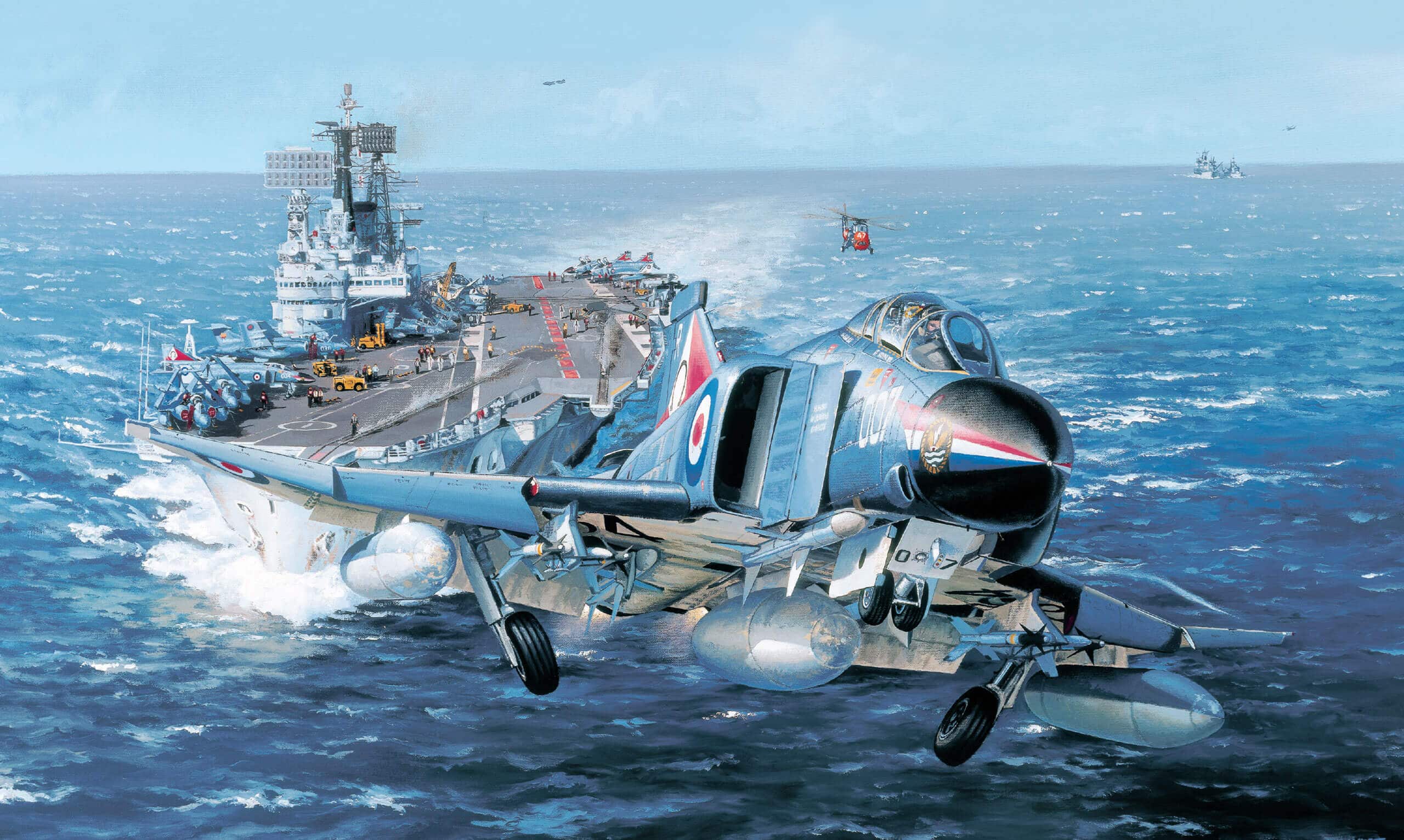 HMS Ark Royal IV – flagship of the Flag Officer Aircraft Carriers – a mobile airfield and a most impressive sight as she launches a Phantom from one of her catapults. She had a standard displacement of 43,000 tons, a beam of 168 feet, and was 846 feet long. Ship’s company numbered 2,570 and her Air Group consisted of Phantom Interceptors, Buccaneer strike and Gannet AEW aircraft together with Wessex SAR and Sea King ASW helicopters. She served her Nation and the Royal Navy for 23 years and sailed 800,000 miles of valuable service, finally being decommissioned in 1979.